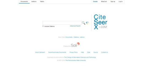CiteSeerX采用机器自动识别技术搜集网上以Postscrip和PDF文件格式存在的学术论文,然后依照引文索引方法标引和链接每一篇文章。CiteSeerX旨在有效地组织网上文献,多角度促进学术文献的传播与反馈。目前,CiteSeerX存储的文献全文达138万多篇,引文2674万多条,内容主要涉及计算机和信息科学领域,主题包括智能代理、人工智能、硬件、软件工程、操作系统等。