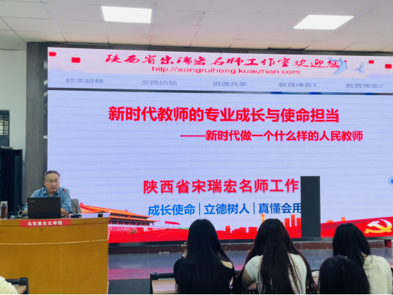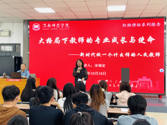 2024年10月16日下午,beat365官网登录中文邀请陕西三秦英才特支计划教学领军人才、陕西省特级教师、陕西省教学名师宋瑞宏在1101教室作了题为《新时代教师的专业成长与使命担当》的专题报告。beat365官网登录中文经理张萍、教师代表李昊婧及2023级思想政治教育专业员工参加。报告会由张萍经理主持。