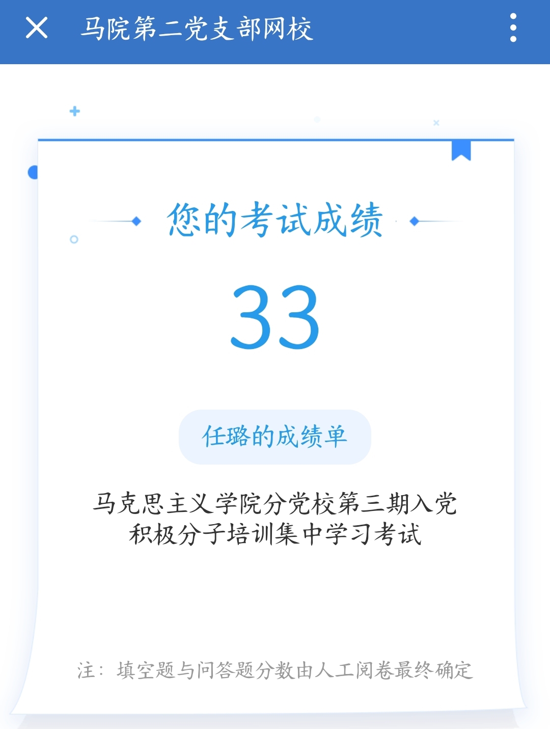 培训结束后,分党校按既定方案,以各环节培训记录或考核成绩为依据,对学员进行了考核,最高分87分,最低分64分,全部考核合格。
