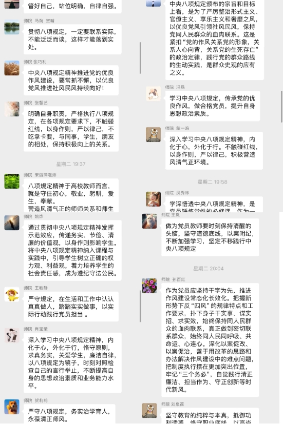 随后组织了党员的心得交流活动,大家纷纷发表看法,认为要将中央八项规定精神的要求内化到教书育人的工作中去;要以身作则,促进教风和学风建设,积极营造风清气正的校园生态环境。
