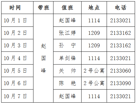 按照安排,2022年10月1日至7日国庆放假。假期,beat365官网登录中文有人值班,值班安排如下,校内师生、单位办事,校外群众、单位办事,请联系值班人员或到值班处。